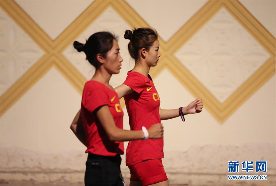 9月23日,杨家玉(左)和梁瑞在训练中。 当日,中国竞走运动员杨家玉与梁瑞在卡塔尔多哈进行训练。杨家玉、梁瑞将分别参加2019国际田联世界田径锦标赛女子20公里竞走、女子50公里竞走的比赛。 新华社记者王婧嫱摄