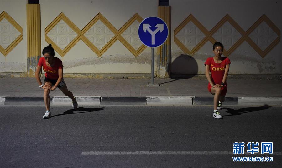 9月23日,杨家玉(右)和梁瑞在训练前热身。 当日,中国竞走运动员杨家玉与梁瑞在卡塔尔多哈进行训练。杨家玉、梁瑞将分别参加2019国际田联世界田径锦标赛女子20公里竞走、女子50公里竞走的比赛。 新华社记者贾宇辰摄