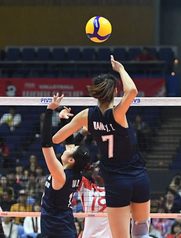 9月24日,中国队球员姚迪(左)和王媛媛在比赛中配合进攻。新华社记者 贺灿铃 摄