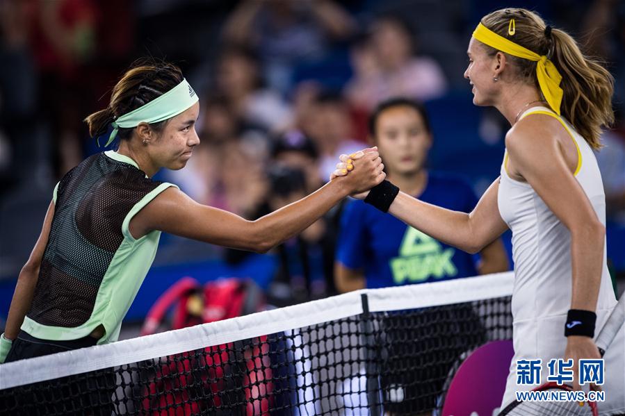 9月24日,中国选手王蔷在赛后向捷克选手布兹科娃握手致意。 当日,在2019年WTA武汉公开赛女子单打第二轮比赛中,中国选手王蔷以2比0战胜捷克选手布兹科娃,晋级下一轮。 新华社记者肖艺九摄