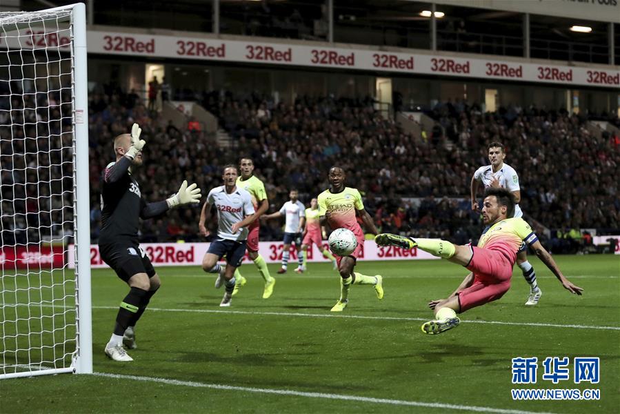 9月24日,曼彻斯特城队球员席尔瓦(前右)在比赛中射门。 当日,在2019-2020赛季英联杯第三轮比赛中,曼彻斯特城队客场以3比0战胜普雷斯顿队。 新华社/美联