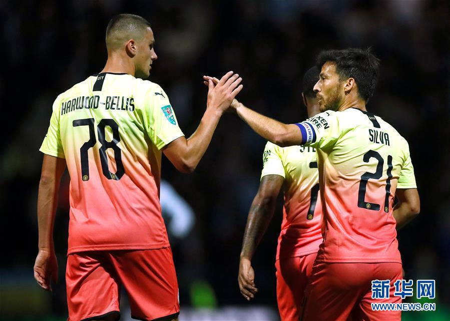 9月24日,曼彻斯特城队球员席尔瓦(右)和哈伍德-贝利斯庆祝对手打入乌龙球。 当日,在2019-2020赛季英联杯第三轮比赛中,曼彻斯特城队客场以3比0战胜普雷斯顿队。 新华社/路透