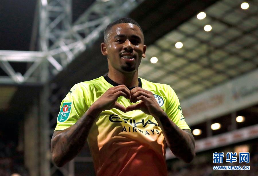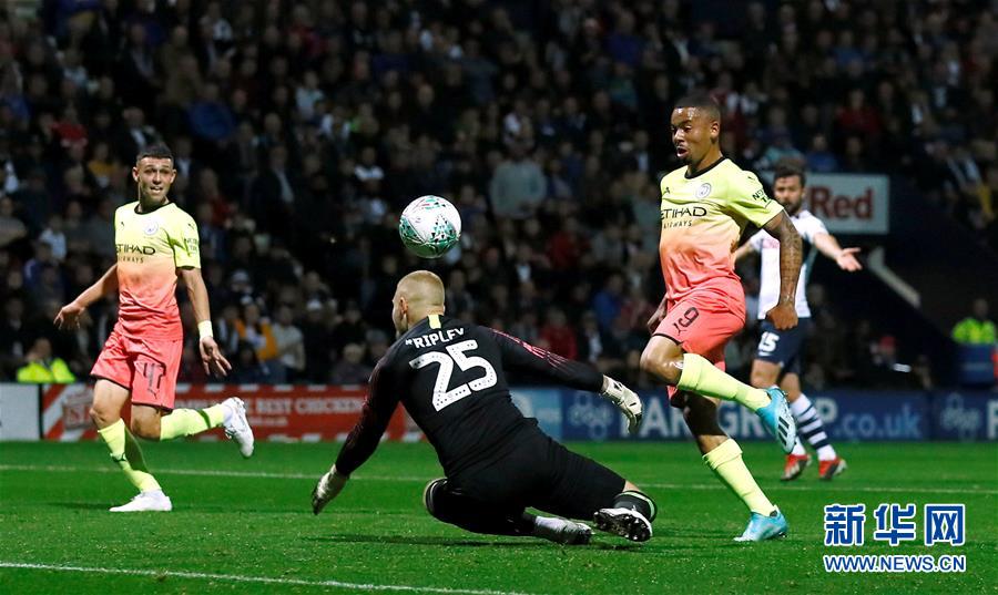 9月24日,曼彻斯特城队球员热苏斯(前右)攻入一球。 当日,在2019-2020赛季英联杯第三轮比赛中,曼彻斯特城队客场以3比0战胜普雷斯顿队。 新华社/路透