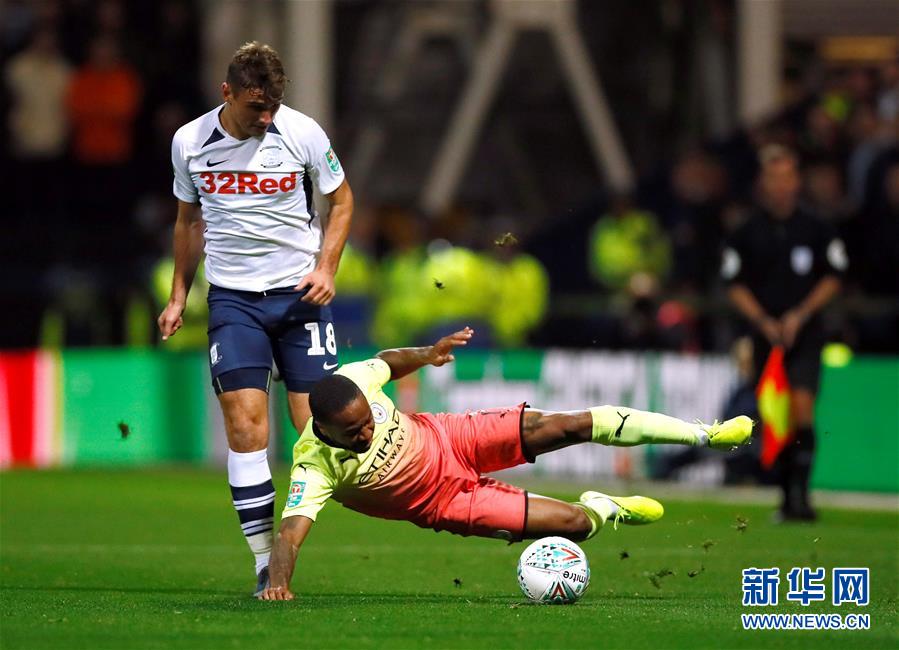 9月24日,普雷斯顿队球员勒德森(左)和曼彻斯特城队球员斯特林在比赛中拼抢。 当日,在2019-2020赛季英联杯第三轮比赛中,曼彻斯特城队客场以3比0战胜普雷斯顿队。 新华社/路透