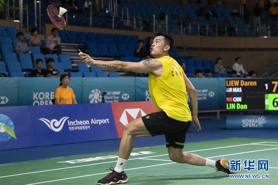 9月25日,林丹在比赛中回球。 当日,在2019韩国羽毛球公开赛男子单打首轮比赛中,中国选手林丹以0比2不敌马来西亚选手刘国伦,无缘第二轮。 新华社发(李相浩摄)