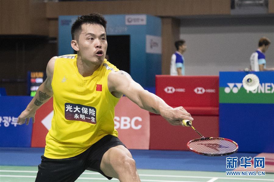 9月25日,林丹在比赛中回球。 当日,在2019韩国羽毛球公开赛男子单打首轮比赛中,中国选手林丹以0比2不敌马来西亚选手刘国伦,无缘第二轮。 新华社发(李相浩摄)