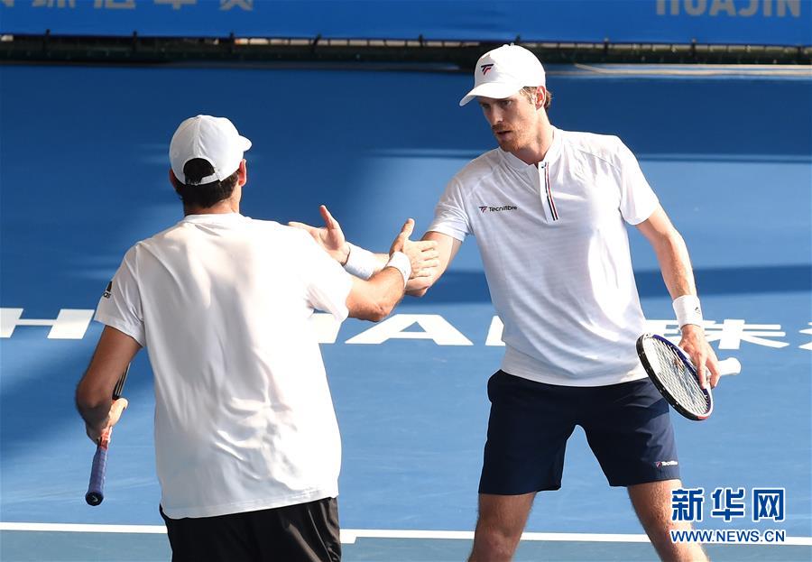 9月25日,丹尼尔(右)/奥斯瓦德组合在比赛中相互致意。 当日,在2019年ATP珠海网球冠军赛男子双打第一轮比赛中,中国组合吴迪/张之臻以0比2不敌丹尼尔(新西兰)/奥斯瓦德(奥地利)组合,无缘八强。 新华社记者卢汉欣摄