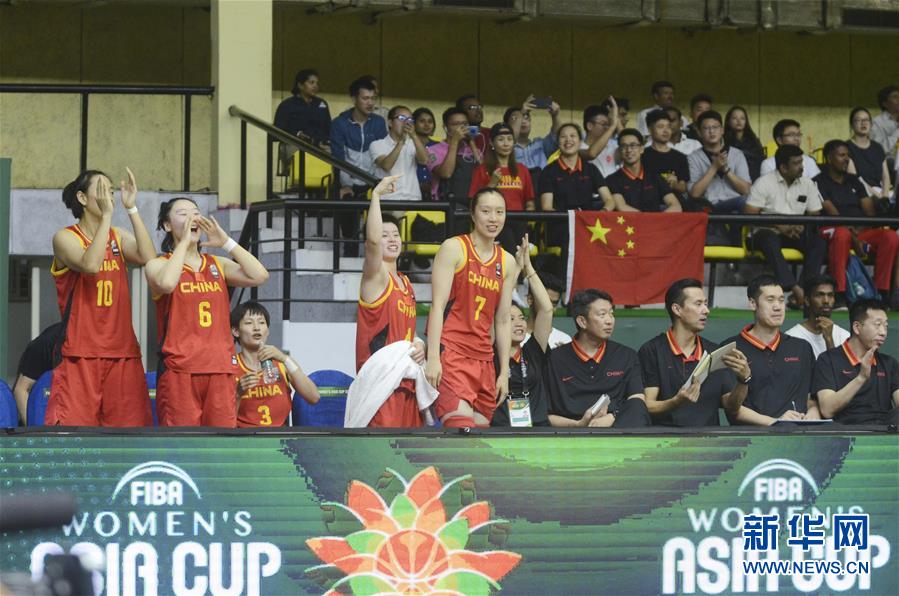 9月25日,中国队球员高颂、武桐桐、杨力维、李缘和邵婷在场边庆祝比赛胜利。 当日,在印度班加罗尔举行的2019女篮亚洲杯B组小组赛中,中国队以104比57战胜菲律宾队。 新华社发(卡希夫·马苏德摄)