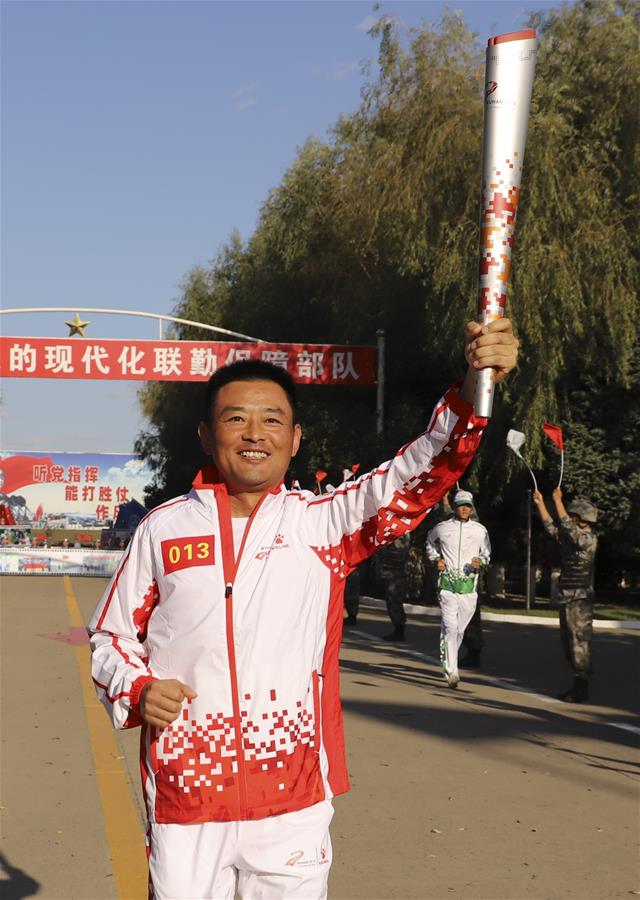 9月25日,火炬手郝军在火炬传递活动中。 当日,第七届世界军人运动会军营火炬传递活动第三站在联勤保障部队某旅举行。本站主题是“筑梦联勤、播撒和平”,共有20名来自联勤保障部队的火炬手参与传递。 新华社发(罗义翀 摄)