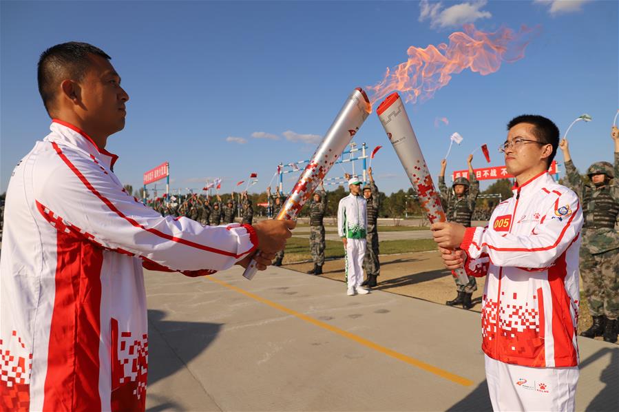 9月25日,火炬手张俊凯(左)与于继伟在火炬传递活动中交接。 当日,第七届世界军人运动会军营火炬传递活动第三站在联勤保障部队某旅举行。本站主题是“筑梦联勤、播撒和平”,共有20名来自联勤保障部队的火炬手参与传递。 新华社发(罗义翀 摄)