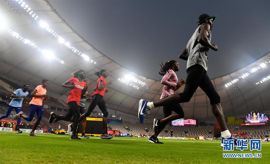 9月25日,运动员在哈里发体育场内热身训练。 当日,位于卡塔尔首都多哈的哈里发体育场在做最后准备,迎接将于9月27日开幕的2019国际田联世界田径锦标赛。 新华社发(尼库摄)