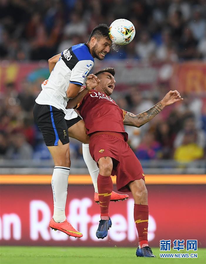 9月25日,罗马队球员佩莱格里尼(右)和亚特兰大队球员帕洛米诺在比赛中争顶。 当日,在2019-2020赛季意大利足球甲级联赛第五轮比赛中,罗马队主场以0比2不敌亚特兰大队。 新华社发(阿尔贝托·林格里亚摄)