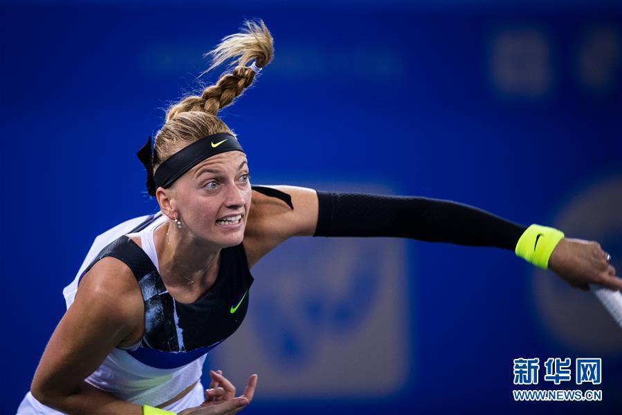 9月25日,捷克选手科维托娃在比赛中发球。 当日,在2019年WTA武汉网球公开赛女子单打第三轮比赛中,捷克选手科维托娃以2比0战胜美国选手斯蒂芬斯,晋级八强。 新华社记者肖艺九摄