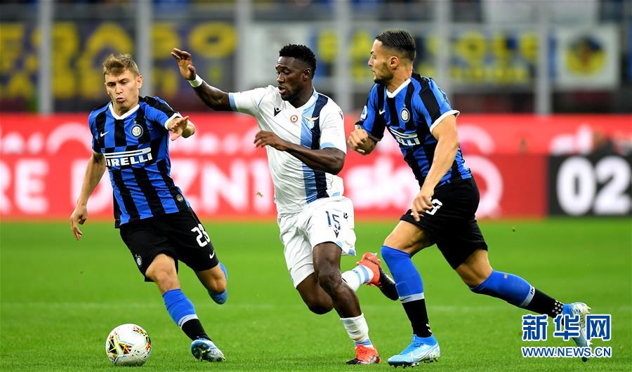 9月25日,国际米兰队球员巴雷拉(左)与拉齐奥队球员巴斯托斯(中)在比赛中拼抢。 当日,在2019-2020赛季意大利足球甲级联赛第五轮比赛中,国际米兰队主场以1比0战胜拉齐奥队。 新华社发(奥古斯托·卡萨索利摄)