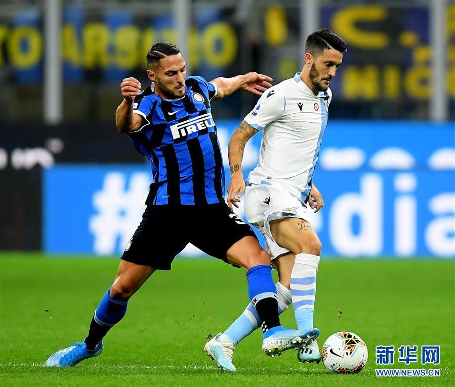 9月25日,国际米兰队球员丹布罗西奥(左)与拉齐奥队球员阿尔贝托在比赛中拼抢。 当日,在2019-2020赛季意大利足球甲级联赛第五轮比赛中,国际米兰队主场以1比0战胜拉齐奥队。 新华社发(奥古斯托·卡萨索利摄)