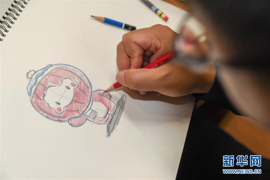 9月26日,团队成员矫强进行“雪容融”表情包手稿创作。 新华社记者张楠摄