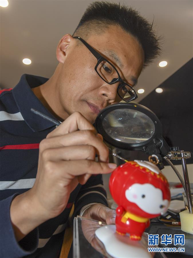 9月26日,团队成员郭昱峰为“雪容融”模型上色。 新华社记者张楠摄