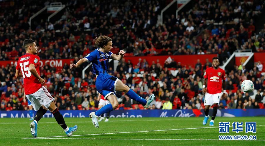 9月25日,罗奇代尔队球员马瑟森(中)在比赛中射门得分。 当日,在2019-2020赛季英联杯第三轮比赛中,曼彻斯特联队主场和英甲罗奇代尔队1比1打平,在点球大战中以5比3制胜,最终以总比分6比4淘汰对手,晋级下一轮。 新华社/路透