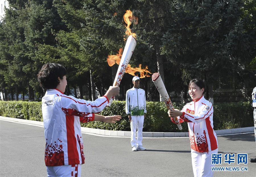 9月27日,火炬手陈金兰(左)与李小花(右)在火炬传递活动中交接。 新华社发(刘健摄)
