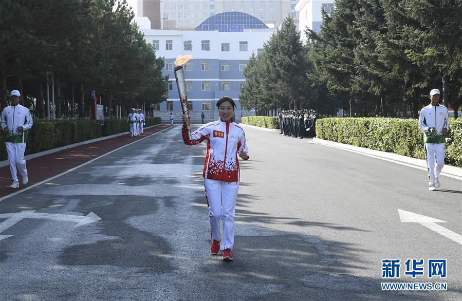 9月27日,火炬手李小花(中)在火炬传递行进途中。 新华社发(刘健摄)