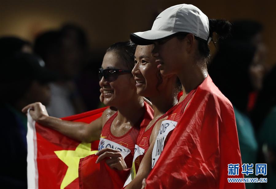 当日,在卡塔尔多哈举行的2019国际田联世界田径锦标赛女子20公里竞走比赛中,中国选手包揽冠亚季军。刘虹以1小时32分53秒的成绩获得冠军,切阳什姐以1小时33分10秒的成绩获得亚军,杨柳静以1小时33分17秒的成绩获得季军。新华社记者 王丽莉 摄