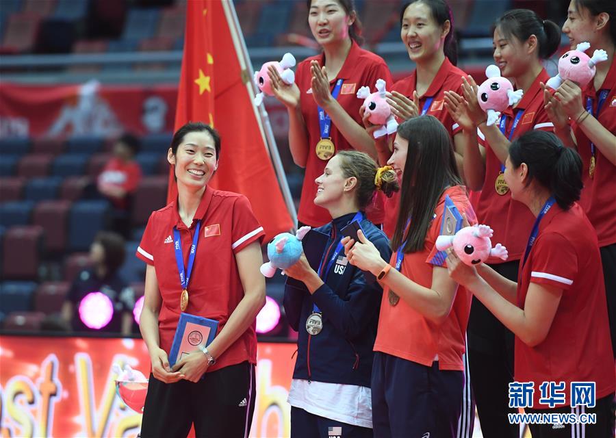 9月29日,中国队球员朱婷(左一)在颁奖仪式上。 当日,2019年女排世界杯赛颁奖仪式在日本大阪举行,中国队在本届比赛中以十一连胜的战绩夺得了冠军。 新华社记者贺灿铃摄
