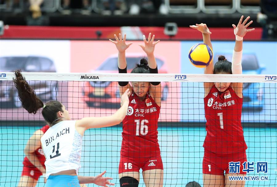 9月29日,中国队球员袁心玥(右)和丁霞(中)在比赛拦网。新华社记者杜潇逸摄