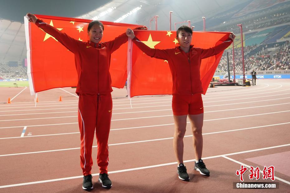 当地时间10月1日晚,在卡塔尔多哈举行的2019国际田联世界田径锦标赛女子标枪决赛中,中国选手刘诗颖与吕会会分别以65米88和65米49的成绩获得亚军和季军。图为刘诗颖(左)、吕会会在比赛后庆祝。中新社记者 泱波 摄
