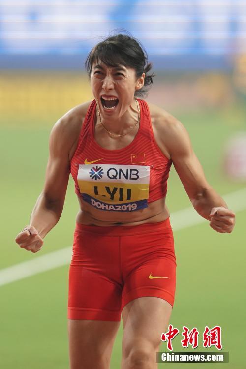当地时间10月1日晚,在卡塔尔多哈举行的2019国际田联世界田径锦标赛女子标枪决赛中,中国选手刘诗颖与吕会会分别以65米88和65米49的成绩获得亚军和季军。图为吕会会在比赛后庆祝。中新社记者 泱波 摄