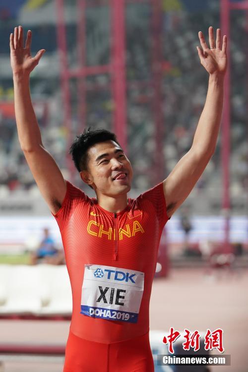 当地时间10月2日晚,在卡塔尔多哈举行的2019国际田联世界田径锦标赛男子110米栏决赛中,中国选手谢文骏以13秒29的成绩获得第四名。图为谢文骏在比赛后向观众挥手致意。中新社记者 泱波 摄