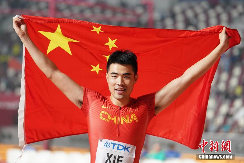当地时间10月2日晚,在卡塔尔多哈举行的2019国际田联世界田径锦标赛男子110米栏决赛中,中国选手谢文骏以13秒29的成绩获得第四名。图为谢文骏在比赛后庆祝。中新社记者 泱波 摄