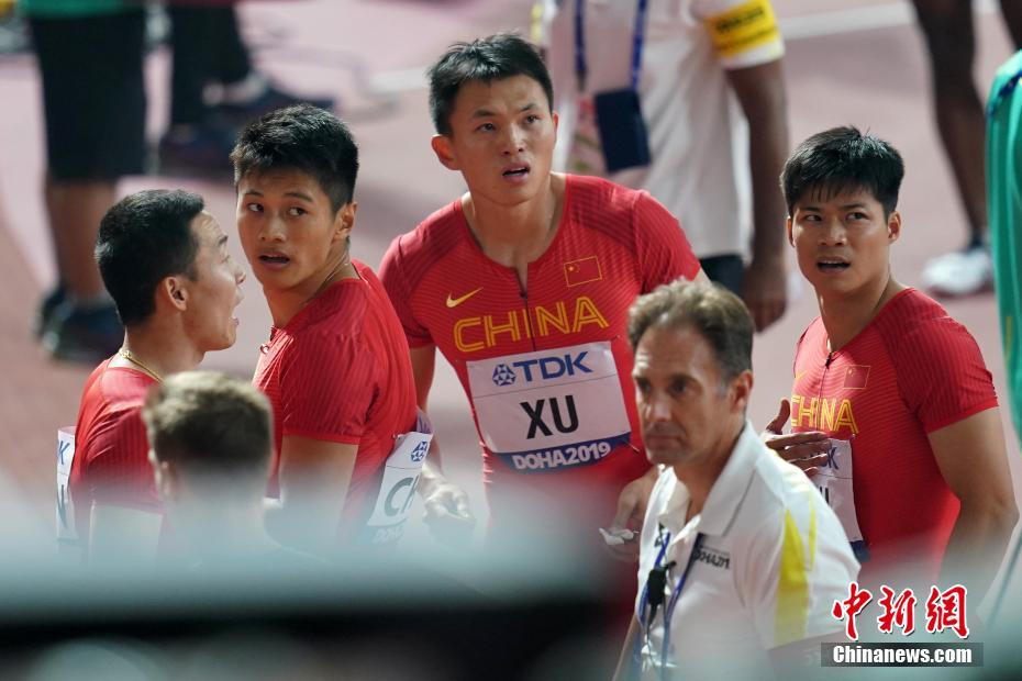 当地时间10月4日晚,在卡塔尔多哈举行的2019国际田联世界田径锦标赛男子4X100米接力中,中国队以37秒79的成绩晋级决赛。图为中国选手吴智强(左一)、谢震业(左二)许周政(左三)和苏炳添(右一)在比赛后查看成绩。中新社记者 泱波 摄