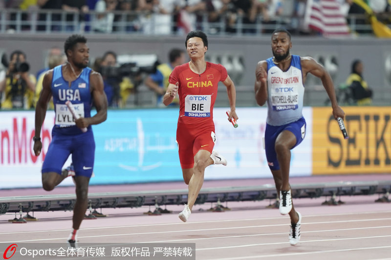 人民网北京10月6日电(赵欣悦) 北京时间10月6日凌晨,在卡塔尔多哈进行的2019年田径世锦赛结束了除了男子马拉松之外的第九比赛日所有赛事争夺。由苏炳添、许周政、吴智强和别舸组成的中国男队以38秒02获得男子4乘100米第六名,顺利获得东京奥运会参赛资格。