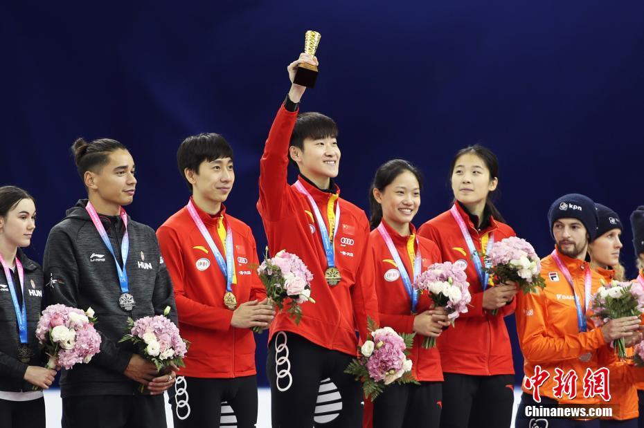 10月5日,国际滑联2019上海超级杯大奖赛进行了2000米混合接力决赛。中国名将韩天宇(左三)率领张添翼(左四)、张楚桐(右三)、王晔(右四)出战,最终新秀张添翼在最后一棒超越匈牙利选手,帮助中国队夺得冠军。图为张添翼举起冠军奖杯。 中新社记者 张亨伟 摄