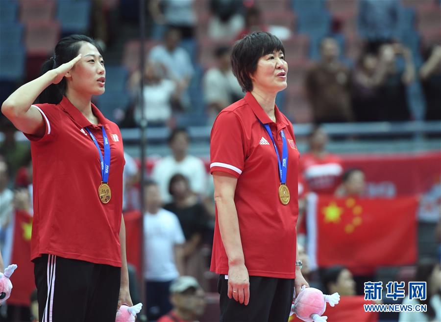 9月29日,中国队主教练郎平(右)在2019年女排世界杯赛颁奖仪式上唱国歌。中国队在本届比赛中以十一连胜的战绩夺得了冠军。 新华社记者贺灿铃摄