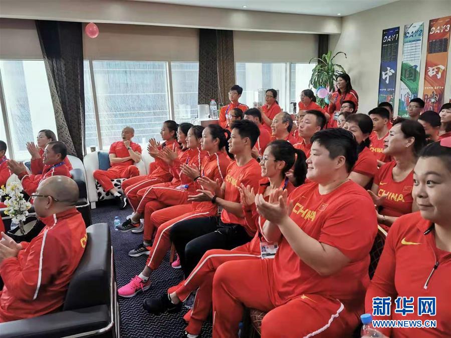 10月1日,参加多哈世锦赛的中国田径队部分运动员、教练员和工作人员在驻地观看国庆70周年庆祝大会转播。 新华社记者马向菲摄