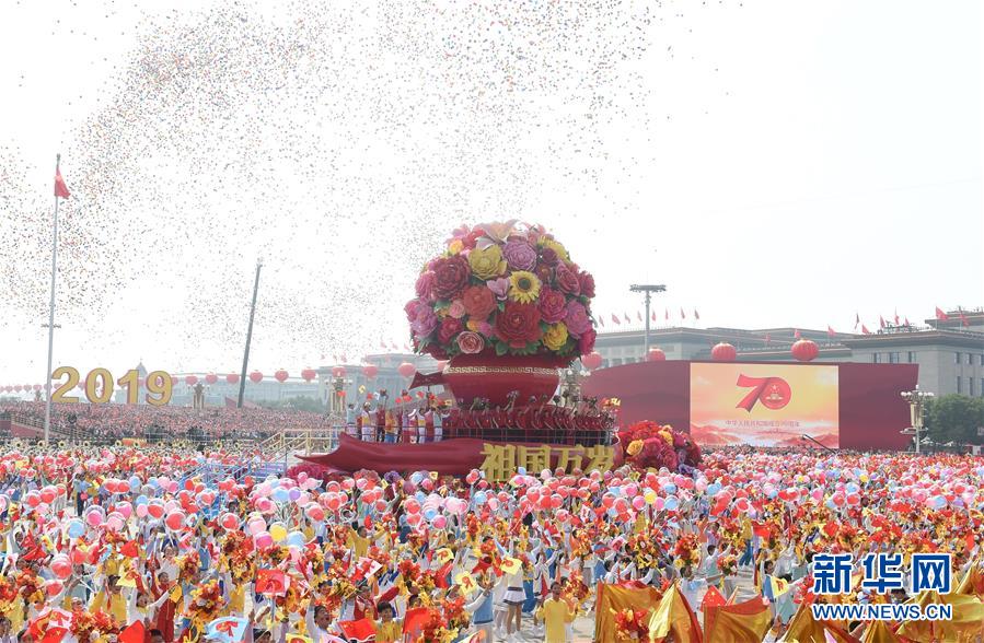 10月1日上午,庆祝中华人民共和国成立70周年大会在北京天安门广场隆重举行。这是中国女排队员、教练员在群众游行中的祖国万岁方阵中。 新华社记者 罗晓光 摄