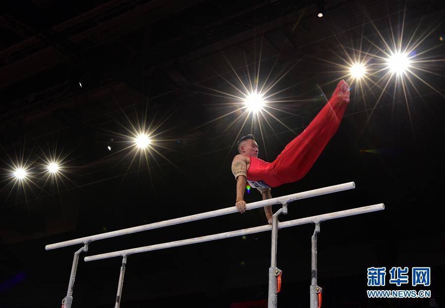 10月7日,中国选手肖若腾在男子双杠项目资格赛中。 当日,在德国斯图加特举行的第49届世界体操锦标赛男子资格赛进入第二个比赛日。 新华社记者 逯阳 摄