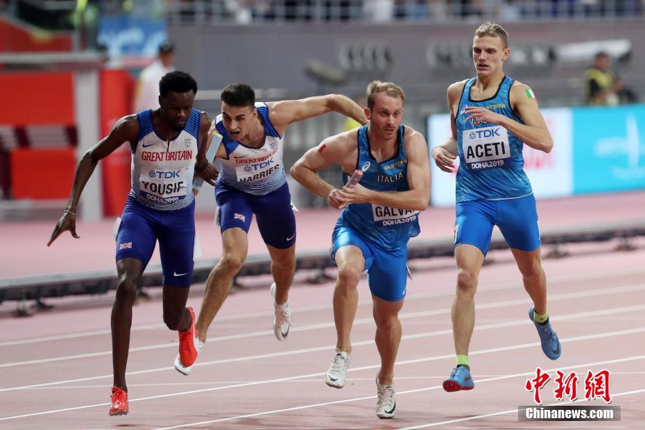 当地时间10月6日,在卡塔尔多哈举行的2019国际田联世界田径锦标赛展开男子4x400米接力决赛的竞争。图为英国队(左)和意大利队在比赛中。 中新社记者 泱波 摄