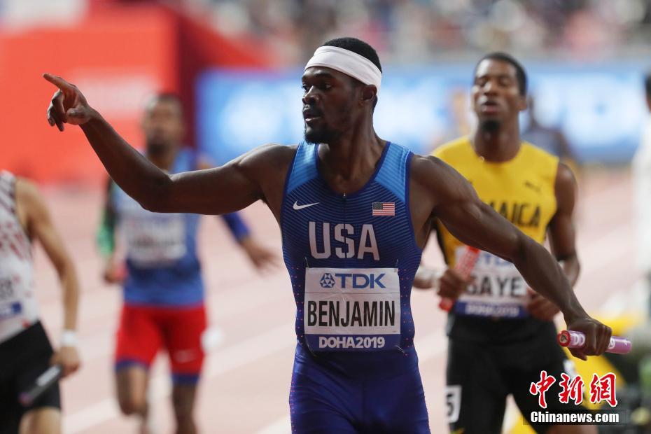 当地时间10月6日,在卡塔尔多哈举行的2019国际田联世界田径锦标赛男子4x400米接力决赛中,美国队以2分56秒69的成绩夺冠。图为美国队最后一棒选手本杰明。 中新社记者 泱波 摄