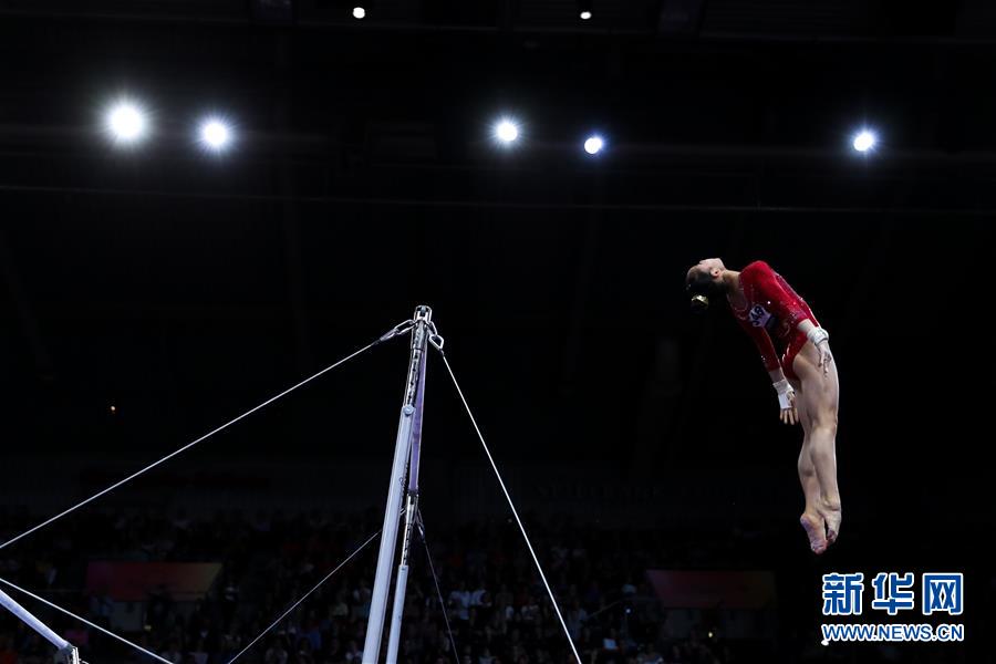 10月8日,中国队选手唐茜靖在高低杠比赛中。 当日,第49届世界体操锦标赛女子团体决赛在德国斯图加特举行。 由刘婷婷、李诗佳、唐茜靖、祁琦、陈一乐和章瑾组成的中国队以164.230分的成绩获得第四名。 新华社记者张铖摄
