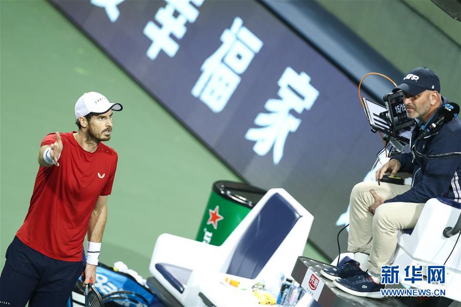 10月8日,英国选手穆雷在比赛中向裁判申述。 当日,在2019年上海大师赛男子单打第二轮比赛中,英国选手穆雷以1比2不敌意大利选手弗格尼尼,无缘下一轮。 新华社记者 吴刚 摄