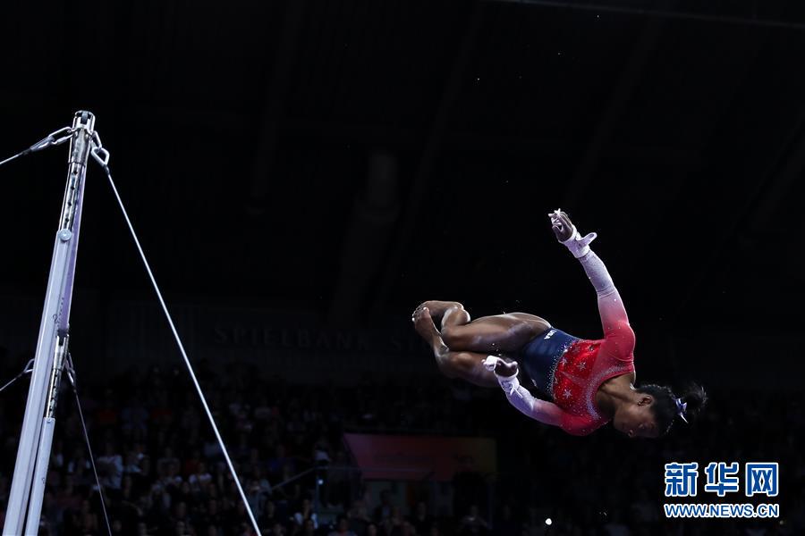 10月8日,美国选手拜尔斯在高低杠比赛中。 当日,在德国斯图加特举行的第49届世界体操锦标赛女子团体决赛中, 美国队以172.330分的成绩夺得冠军。 新华社记者张铖摄