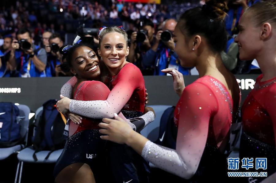 10月8日,美国选手拜尔斯(左一)在比赛结束后拥抱队友。 当日,在德国斯图加特举行的第49届世界体操锦标赛女子团体决赛中, 美国队以172.330分的成绩夺得冠军。 新华社记者张铖摄