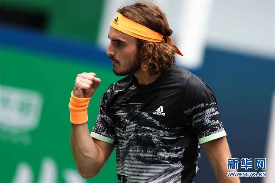 10月9日,希腊选手西西帕斯在比赛中庆祝得分。 当日,在2019年上海大师赛男子单打第二轮比赛中,希腊选手西西帕斯以2比0战胜加拿大选手奥热-阿利亚西姆,晋级下一轮。 新华社记者 吴刚摄
