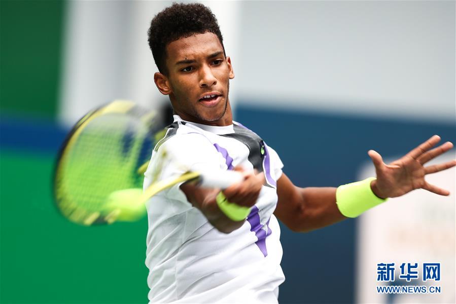10月9日,加拿大选手奥热-阿利亚西姆在比赛中回球。 当日,在2019年上海大师赛男子单打第二轮比赛中,希腊选手西西帕斯以2比0战胜加拿大选手奥热-阿利亚西姆,晋级下一轮。 新华社记者 吴刚摄