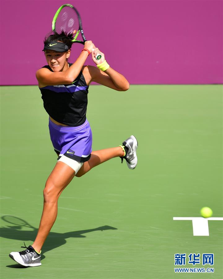 10月9日,王曦雨在比赛中回球。 当日,在2019年WTA天津公开赛单打第二轮比赛中,突尼斯选手乌恩斯·贾巴尔以2比0战胜中国选手王曦雨。 新华社记者李然摄
