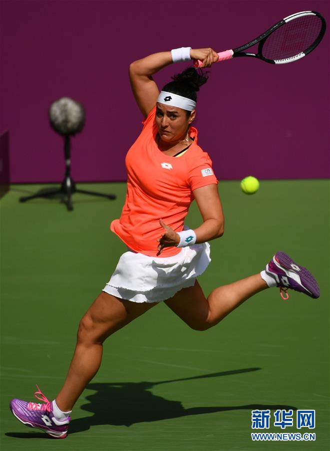 10月9日,乌恩斯·贾巴尔在比赛中回球。 当日,在2019年WTA天津公开赛单打第二轮比赛中,突尼斯选手乌恩斯·贾巴尔以2比0战胜中国选手王曦雨。 新华社记者李然摄