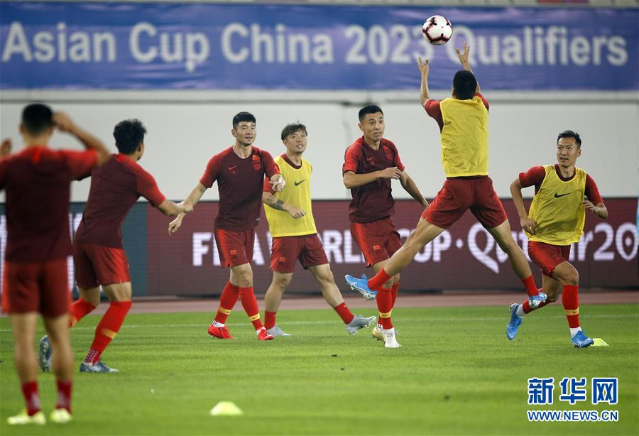 10月9日,中国队球员在训练前热身。 当日,中国国家男子足球队在广州天河体育中心集训,备战2022年国际足联卡塔尔世界杯亚洲区预选赛第二轮对阵关岛队的比赛。比赛将于北京时间10月10日在广州举行。 新华社记者 丁旭 摄