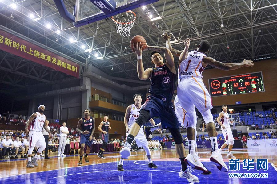 10月9日,广东东莞银行队球员曾繁日(右三)与浙江稠州银行队球员兰兹博格在比赛中争抢。 当日,在江西上饶进行的2019-2020赛季CBA季前赛中,浙江稠州银行以109比88战胜广东东莞银行。 新华社记者 周密 摄